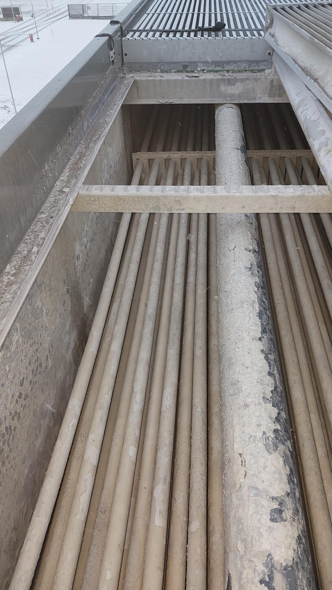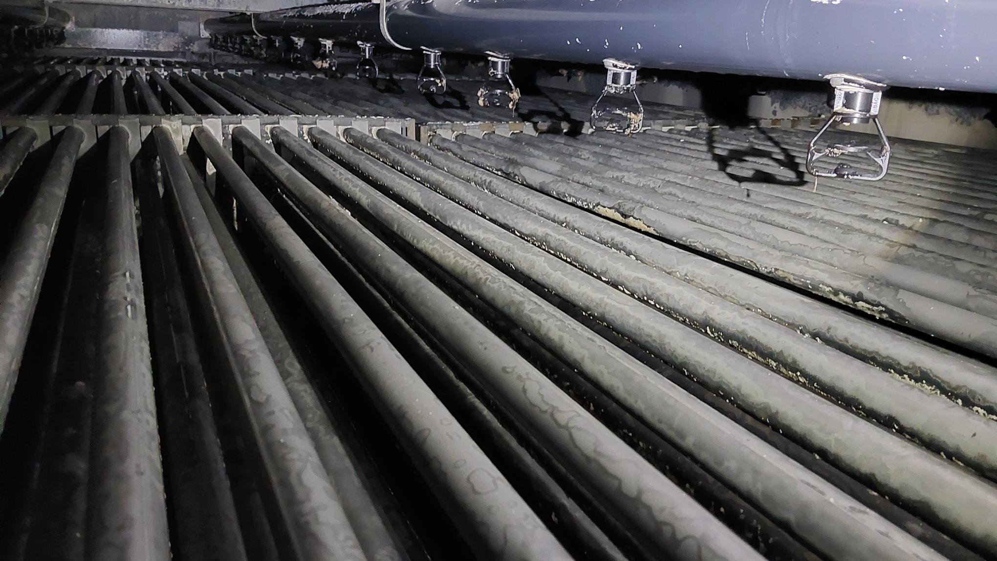 Evaporative condensers are equipped with a tube bundle which holds refrigerants – such as ammonia – on the inner side. During operation, water is used to cool down the media inside the tubes. When the water treatment is not working correctly, fouling will become present, usually in the form of scaling (calcium carbonate). The scale accumulation will be most present on the tube bundle since this is where the heat transfer is taking place. Keeping the tubes clean is crucial to maintain an efficiently operating system. In short:
