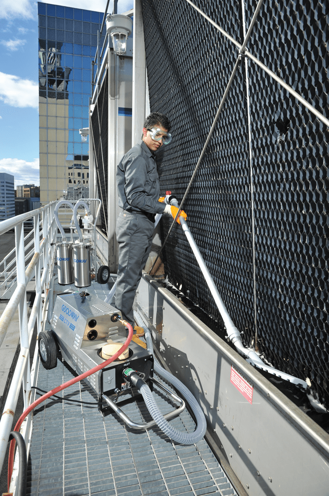 Cooling tower basins are prime locations for the growth of harmful bacteria, and conventional water treatment cannot fully remove biological matter. Only mechanical cleaning can effectively eliminate debris, sludge, and biofilm. The Goodway® CTV-1501 system safely and efficiently removes bacteria – including Legionella – and other micro-organisms, as well as algae, mud, and sludge from the sides and floor of any cooling tower basin or sump.